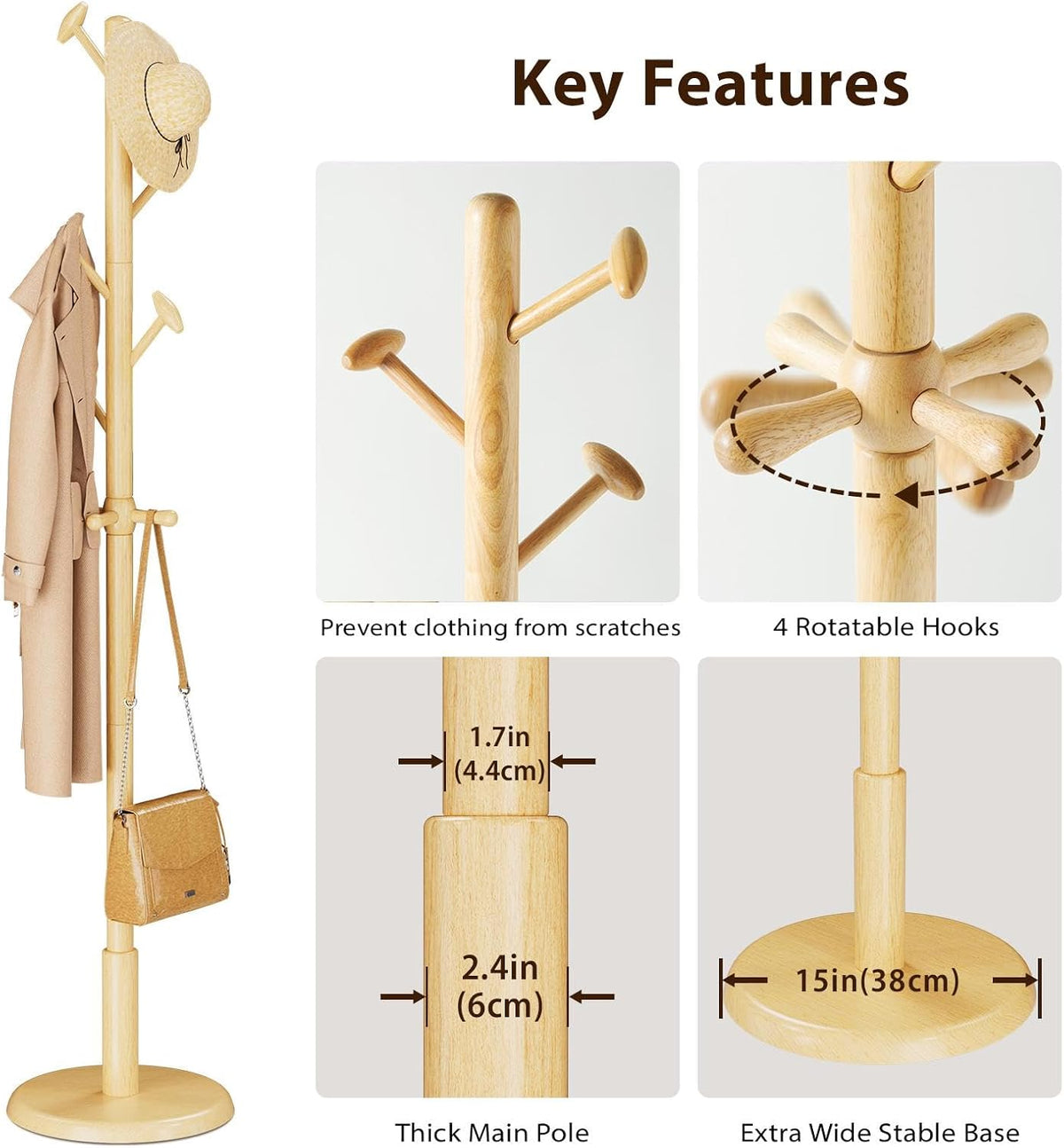 TAITIY Solid Wood Clothes Rack with 2 Shelves & 5 Hooks, Size S, Walnut Brown
