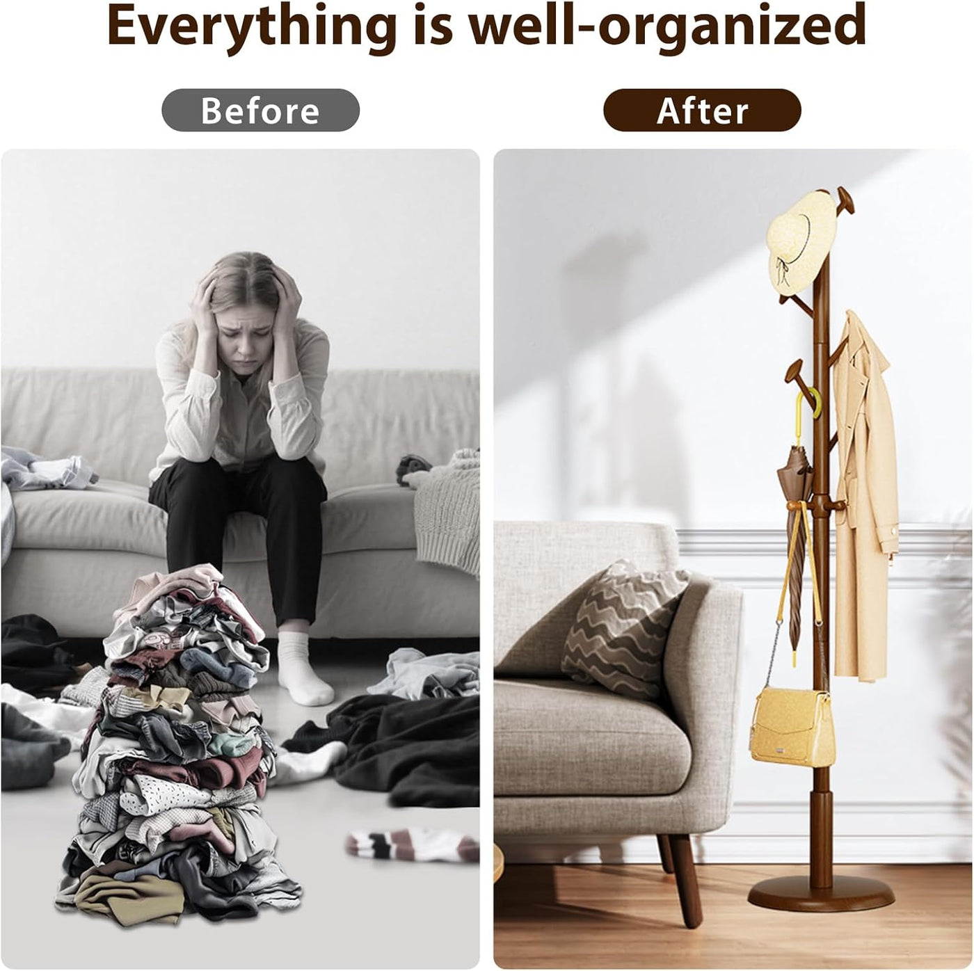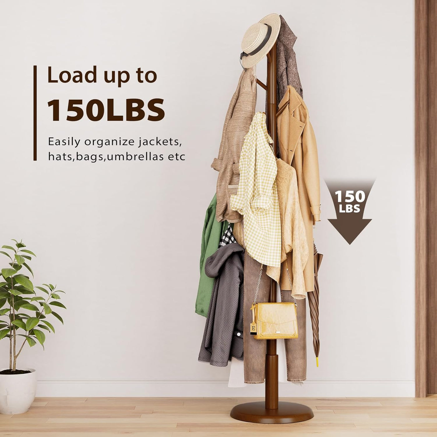 Keep entryways tidy with this freestanding coat tree made from 100% solid rubberwood. A wide 15" x 15" base delivers wobble‑free stability up to 150 lb, while 10 polished hooks set at 45° prevent garments from slipping. Assembles in minutes with included tools. The warm walnut brown finish suits modern and classic interiors—perfect for coats, hats, scarves, handbags, and umbrellas in entryways, bedrooms, and offices.